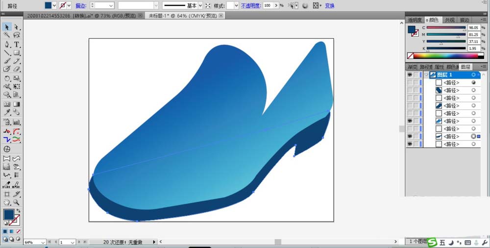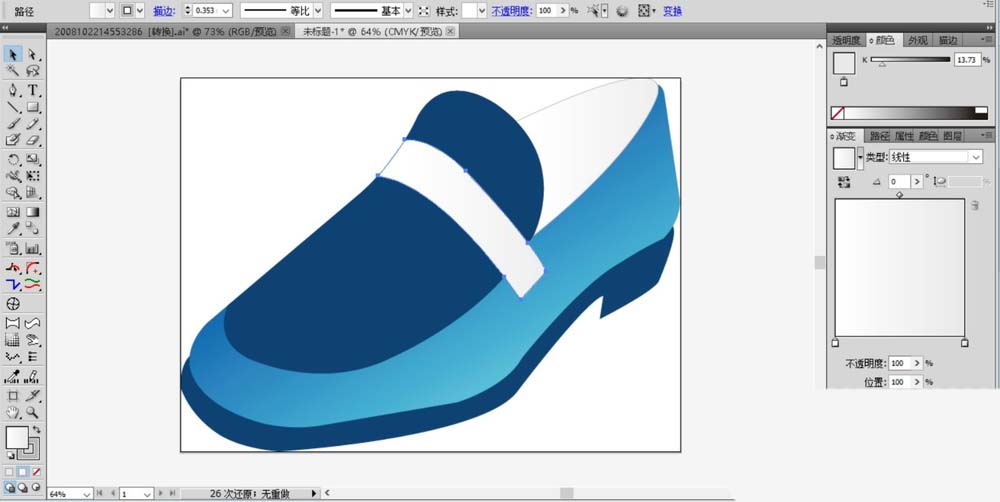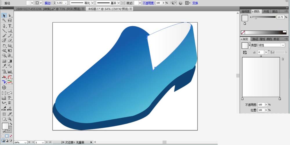 2、设置蓝色的渐变,我们用蓝色的渐变填充这个鞋面路径。