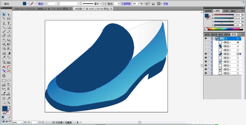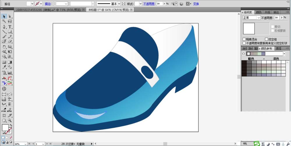7、最后,我们主要进行单皮鞋的细节元素的绘制,使用圆形绘制出鞋带上面的蓝色扣子,使用钢笔绘制出单皮鞋上面的高光路径并填充半透明的白色,单皮鞋图片设计完成。