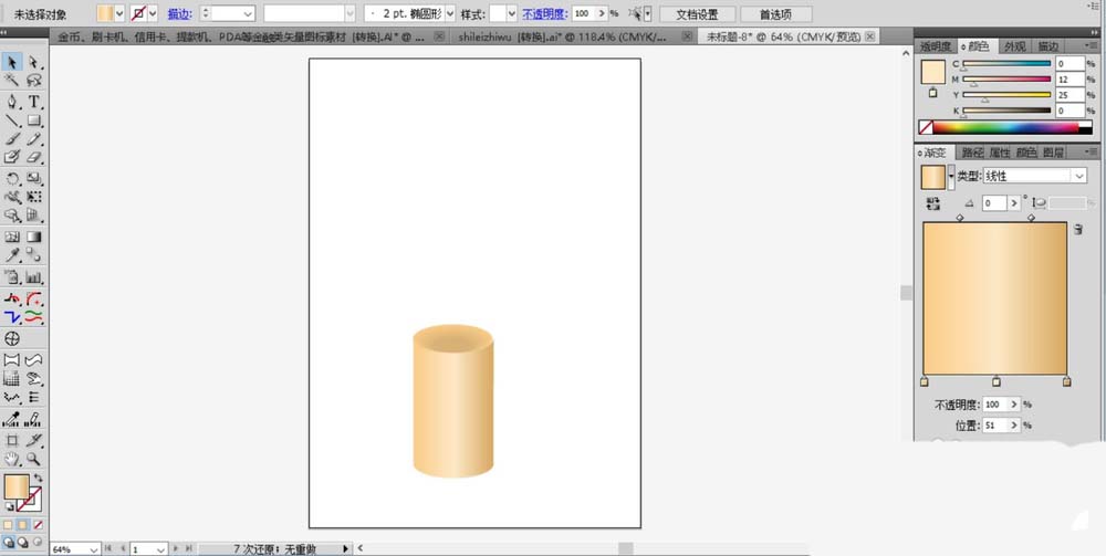 1、先用钢笔画出一个竹筒的正面路径,我们用土黄色的渐变填充这样的正面路径。