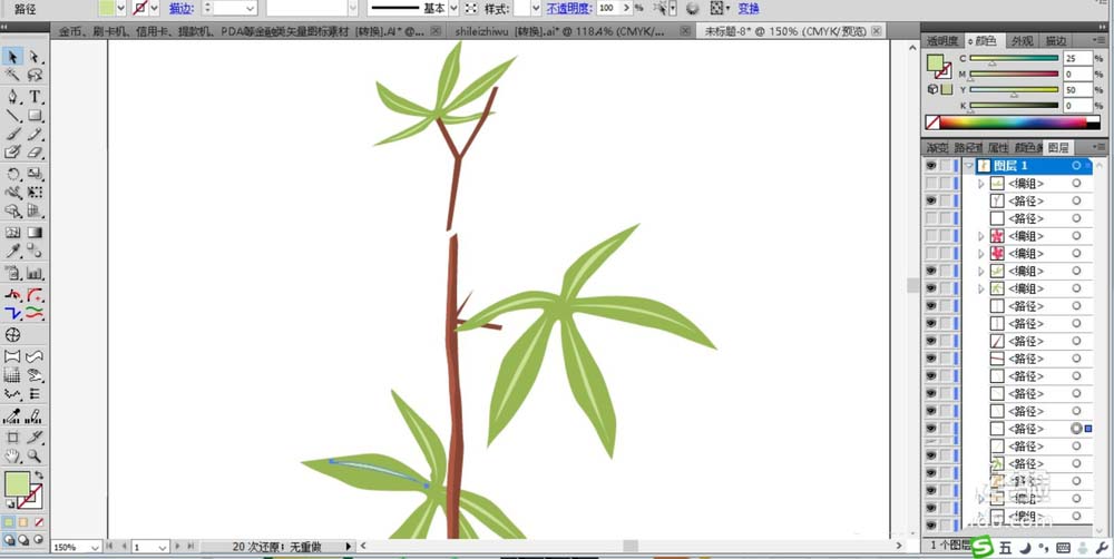 4、继续复制叶片到枝条的中间与上面,让叶片逐渐变小。