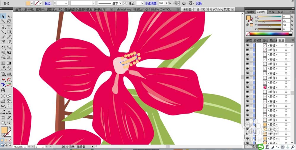 6、继续用同样的方法绘制出另外的一朵小花,我们在花的中心绘制出花蕊的路径,我们用橙黄色填充花蕊路径,花瓶图片设计完成。