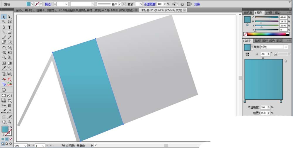 4、我们用天蓝色的渐变填充桌卡的左侧面,用灰白色的渐变填充桌卡的右侧面。