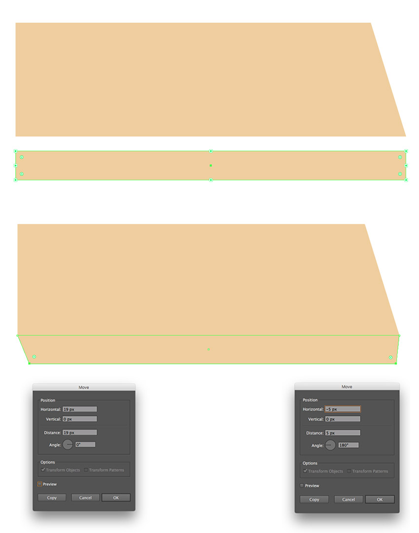 步骤2、创建另一个 607 x 55 像素的矩形 #eecf98 , 并把它放在我们的主要部分底部。使用直接选择工具 (A), 选择右下角锚点。按 enter 键再次打开 "移动选项" 窗口, 并将水平值设置为-5 像素和垂直值为0像素, 将点向左移动。为左下角锚点打开同一窗口。将水平值设置为19像素, 垂直于0像素, 将我们的拐角向右移动。