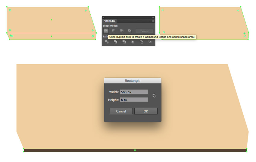 步骤3、同时选择两个形状, 并使用 "路径查找器" 面板的 "联合" 选项将它们合并为一个形状。使用具有 #4f412f 颜色的 583 x 8 像素矩形, 在底部形成条纹。
