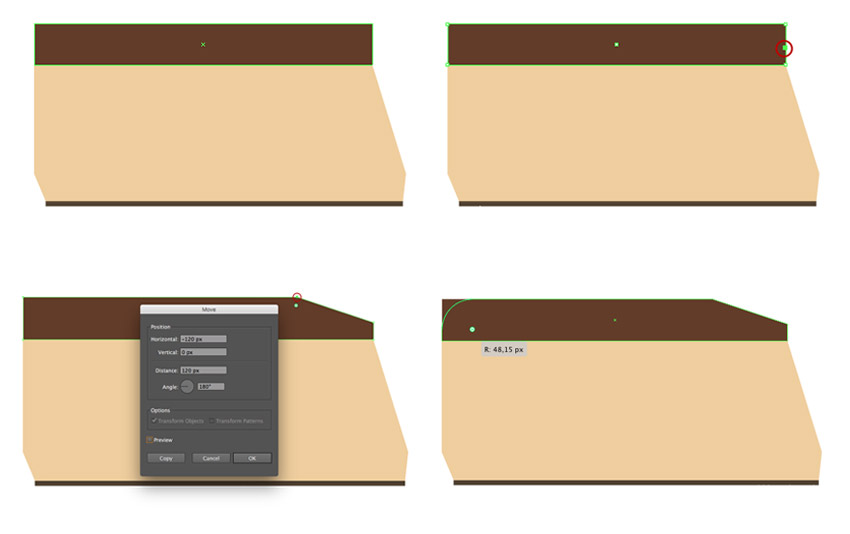 步骤1、让我们开始绘制一个拖车的身体从 607 x 177 px #eecf98 的矩形开始, 用直接选择工具 (A) 选取右上锚点, 然后按 enter 打开 "移动" 窗口。将水平值设置为-55 像素, 垂直值为0像素, 然后按 "确定", 将右上角锚点向左移动。