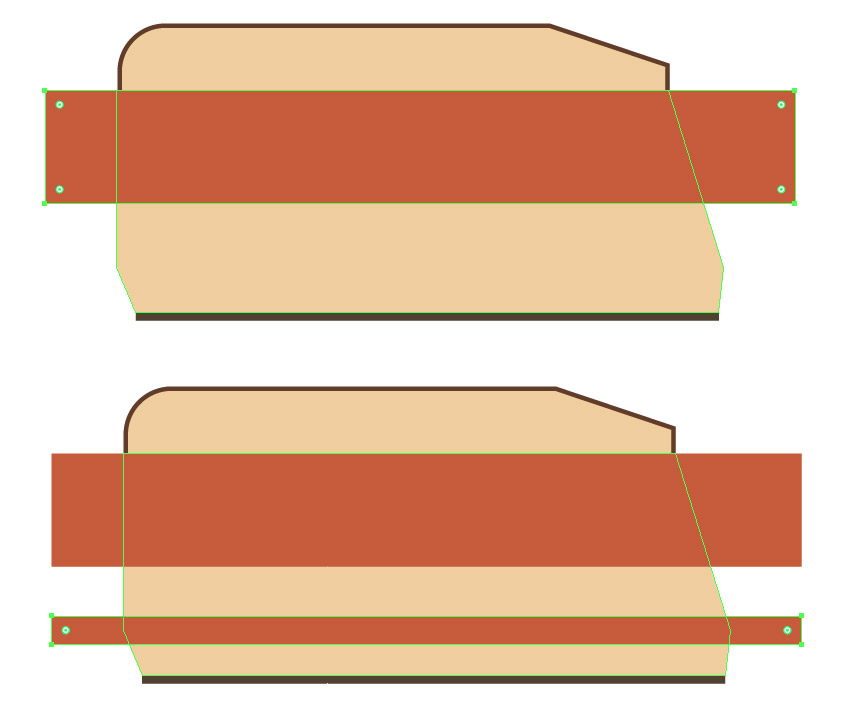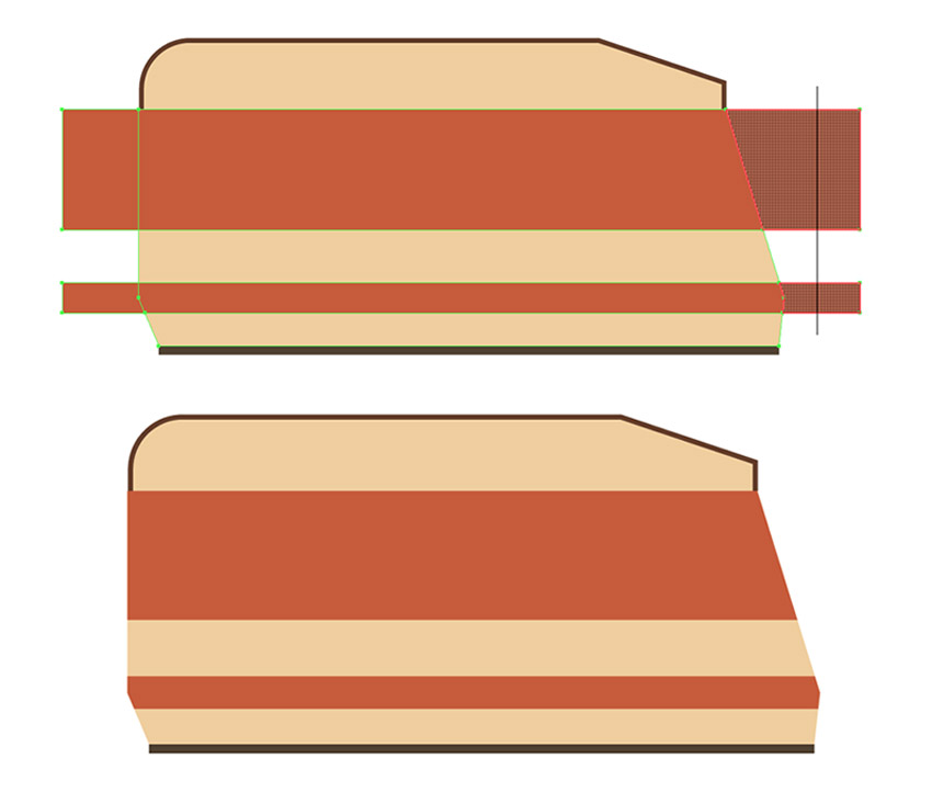 步骤4、因为我们已经完成了高光, 现在是时候为车子添加阴影。选择车最大的形状, 并在它的前面做个副本。向下拖动副本, 将其上边缘置于红色条纹之上, 使其完全与拖车的底座重叠。将二个形状添加到所选内容, 并使用 "路径查找器" 面板的 "相交" 选项。将结果部件的颜色更改为 #d9b97b。用同样的方式在门的下部添加阴影。(这里可以多复制一份,以免做错)