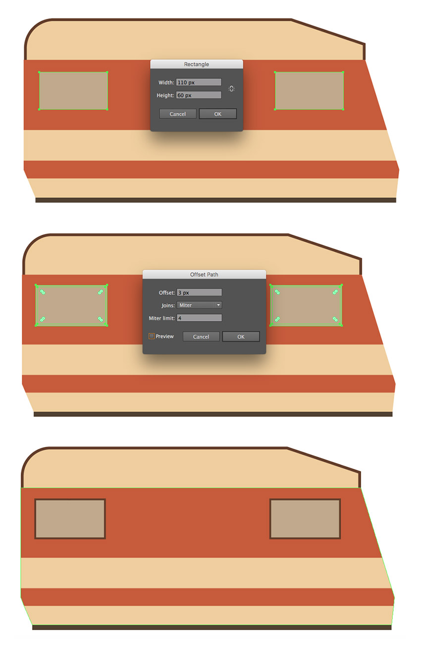 步骤3、绘制两个 110 x 60 像素的矩形 (#bfa989)作为窗户, 将它们放置在较大红色条纹的左右部分附近。选择窗口并转到对象 >> 路径 > 偏移路径。输入3像素的偏移量, 并将轮廓的填充颜色设置为 #613d26。