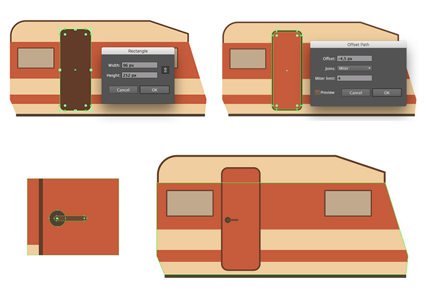 步骤4、开始创建一个门, 通过绘制一个 96 x 252 px 圆角矩形 (#613d26) 在拖车左半部分附近的窗户旁边。在门和右边的窗户之间留出一个空的空间, 使用 "门" 形状的偏移路径, 将偏移值设置为-4.5 像素。将内部形状的颜色更改为 #c25c34。通过使用椭圆工具 (L) 来创建一个(#4f412f) 28.5 x 4.5 像素的圆角矩形和 (#664b2e) 一个 14 x 14 px 圆, 构建一个简单的门手柄。