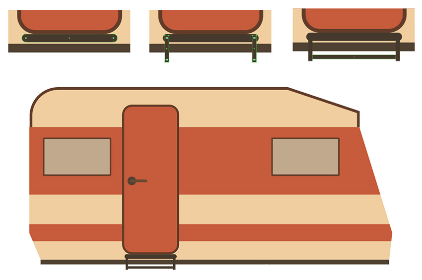 步骤4、在拖车的车身顶部建立一个 552 x 67 像素的矩形, 使用 #613d26 来着色它。使用添加锚点工具 (+), 并在形状的右边缘的底部添加一个附加的锚。使用前面的方法, 将右上角的锚点向左移动大约120像素。使用直接选择工具 (A) 选择棕色形状的左上角锚点。你可以看到角落里显示的圆角小部件。只要抓住小部件, 把它拉到中心, 这样就会出现圆角。