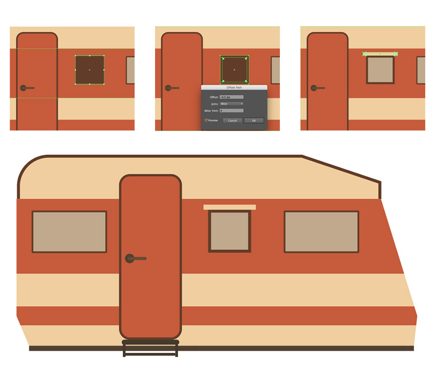 步骤3、让我们创建一个通风口。在小窗户的下方生成一个 50 x 13.5 像素 (#222529) 的矩形, 并使用偏移路径方法形成3像素的描边, 并将其颜色设置为 #d9b97b。在形状和组 (ctrl+ G) 中添加两个相同颜色的条纹。复制通风口, 将副本放在拖车的底部装饰条上。使描边的颜色变暗一点。