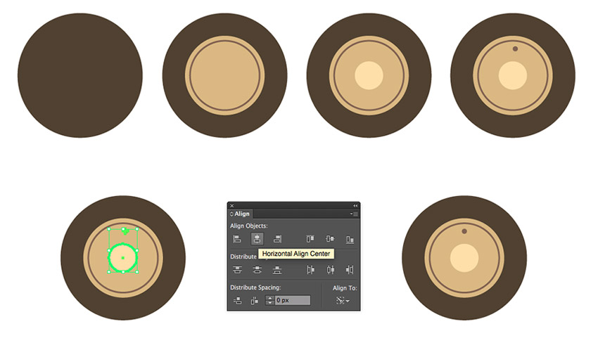 步骤1、采取椭圆工具 (L), 并创建一个 75.5 x 75.5 px 圆的 #4f412f 颜色的车轮。在内部添加两个较小的圆圈: 一个 48 x 48 px 圆圈的 (#d9b97b)和 一个42 x 42 px的圆圈没有填充, 但有 2 px (#80624f )颜色的描边。在中间创建一个 17 x 17 像素的圆 (#fde0a1)。在创建一个小的 3 x 3 px 的圆圈 (#80624f), 将其置于先前创建的未填充的圆上。保持选定的较小圆圈, 将内部圆圈添加到选定内容中, 再单击内部形状, 使其成为关键对象。在 "控制面板" 和 "对齐" 面板中自动选择 "对齐" 对象。在 "对齐" 面板 ("窗口 >> 对齐") 或 "控制" 面板上, 单击 "水平对齐中心" 按钮。这里的灰色的部分就是说你要把第小的和第二小的圆对齐最大圆的中心