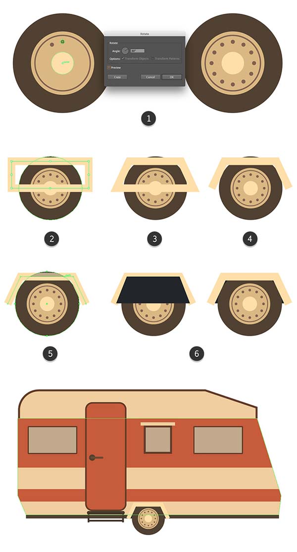 步骤2、选择小圆圈, 使用旋转工具 (R), 然后 Alt/选项-单击在车轮中间。在 "旋转" 面板中, 将角度设置为 "30°", 然后单击 "复制" 按钮。按下ctrl+ d 重复最后一个动作, 并继续按下ctrl+ d, 在中心 (1) 周围添加所有12个圆圈。开始创建一个装饰的边缘, 通过绘制一个 92 x 32 px的 矩形没有填充, 并与 #fde0a1 的颜色相同的9 px 宽的描边, 放置在车轮的顶部, 并使用对齐面板对其中心 ,然后我们选底部的锚点分别左右移动相同的像素(比如像左移动15px那么右边就是-15px)使其成为一个梯形。然后用直接选择工具删除底部锚点。(2)我们可以复制一份前一步的梯形然后留下填充去掉描边,然后将他与梯形合体打组放到轮胎的后面。最后我们就可以把它放到汽车的底部去了。