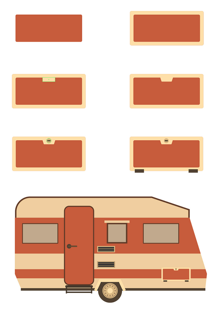 步骤4、在拖车的底部添加一个小门。只需在拖车外绘制一个 83.5 x 34 像素的矩形 (#c25c34), 稍微圆角一些。使用偏移路径添加4.5 像素的描边, 将其颜色设置为 #fde0a1。将 16 x 5 像素的矩形 (#fde0a1) 绘制在红色内部的顶部下方, 使其与中部对齐。将其底部锚点稍稍拖动到中心轴上, 然后将其放入。将 6 x 6 px 的圆圈(#d9b97b) 放置在梯形形状的中心, 并在中间 (#4f412f) 添加一个小圆角矩形, 形成一个锁孔。在铰链轮廓的下边缘添加两个 11.5 x 5 像素D矩形 (#4f412f)。打组 (ctrl+ G) 所有部件, 并把他放在拖车的右下半部分。