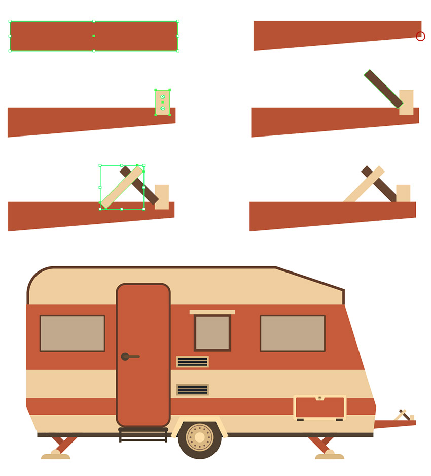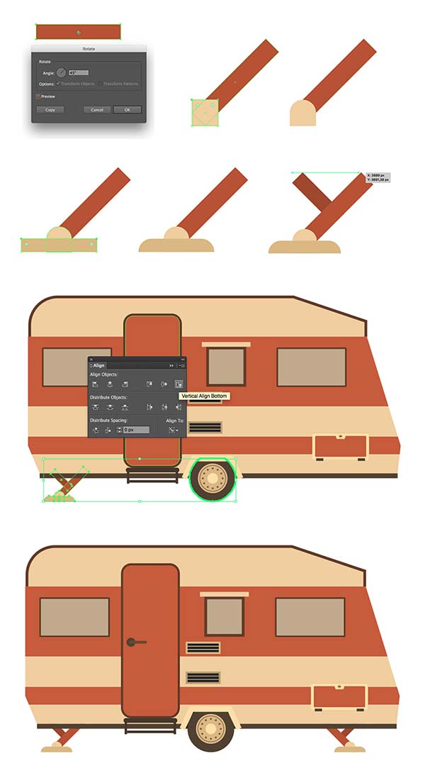 步骤5、下一部分, 我们要创建的是一个拖车的柱子。建立一个 68 x 12 像素的矩形, 填充为#b3532d。选择形状并转到对象 >> 转换 > 旋转。将角度值设置为45度, 然后按 "确定"。在底部的前面绘制一个 17 x 17 像素的矩形 (#eecf98), 并使其顶部圆角。绘制一个 50 x 9 像素的形状 (#d9b97b), 并将其附加到圆角矩形的下边缘。使其上锚点圆角。制作一个较小的红色矩形副本, 并将其旋转45度到左侧。将颜色更改为深色红色 (#9c4827)。将副本放到较大形状的后面, 将其顶部定位点置于同一级别。打组 (ctrl+G) , 并把它放在我们的拖车的左下半部分。然后复制一份水平方翻转到车子的右边。