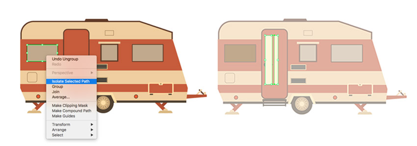 步骤1、让我们从左窗户添加反射开始。使用直接选择工具 (A) 选择它, 然后右键单击并从下拉菜单中选择 "隔离选定的路径"。独立窗户以全彩色显示, 而其余的图稿则显示为灰色。创建两个长的垂直矩形 (#fef7d9), 然后要宽度不一样哦!