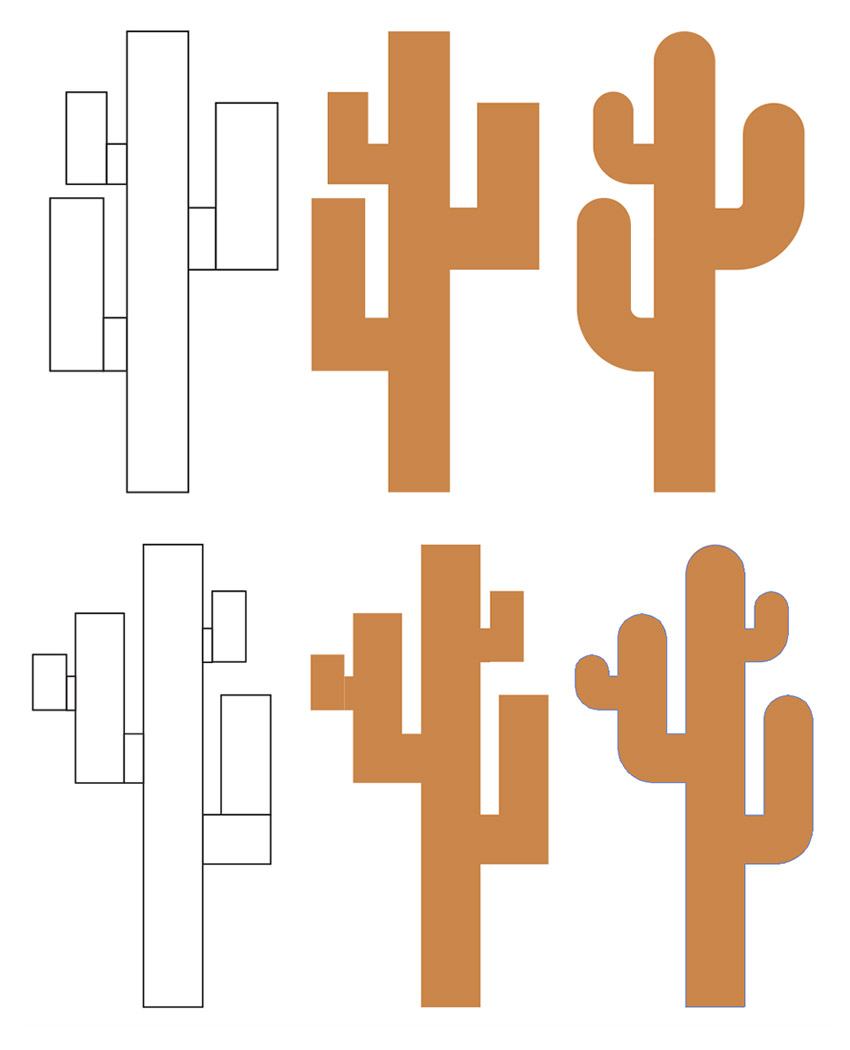 步骤1、让我们通过制作两个仙人掌开始创建背景元素吧。使用简单的矩形来构造每个仙人掌形状。然后, 将它们合并为一个图形, 并通过拖动每个锚点的圆圈指示器来圆角。将植物的颜色设置为 #c7873e。(仙人掌可以去网络上面找参考)