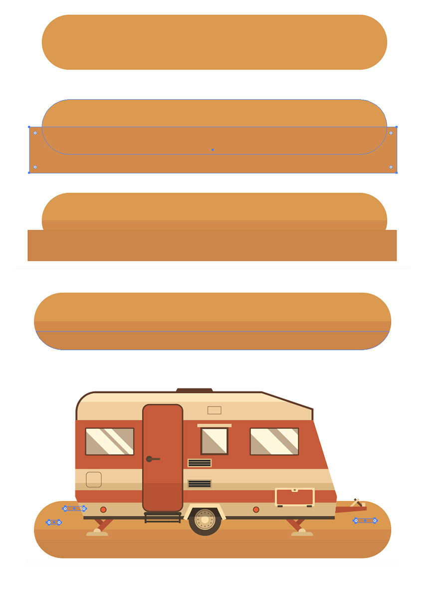 步骤2、绘制一个 830 x 132 像素的圆角矩形 (#d99b41) 作为水平地面。在底部添加两个阴影部分。用颜色较深的矩形来制作,使用路径查找器来切掉不要的部分(做法已经在之前的文章说过,上面也涉及到了,不重复说),以模拟沙子的质地。然后我们把它放到小汽车的底部就好了 。