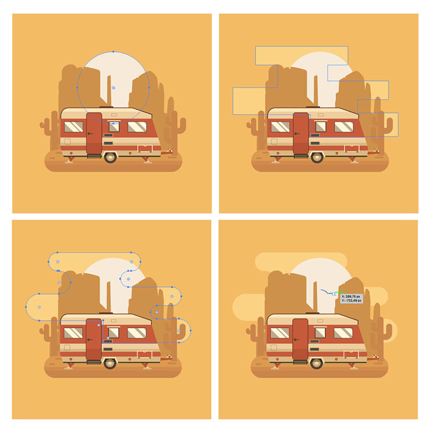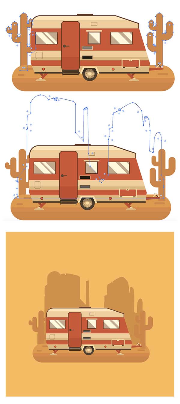 步骤3、把我们的仙人掌放在露营地附近。然后使用钢笔工具 (P) 画一幅沙漠山脉的剪影。你可以使用一些从互联网上的照片作为参考。我的灵感来自亚利桑那州的沙漠景色, 而我正在绘制这些山脉。使用 #cc923d 颜色的山, 并添加一个正方形的背景, 填补它与 #f2bc55。