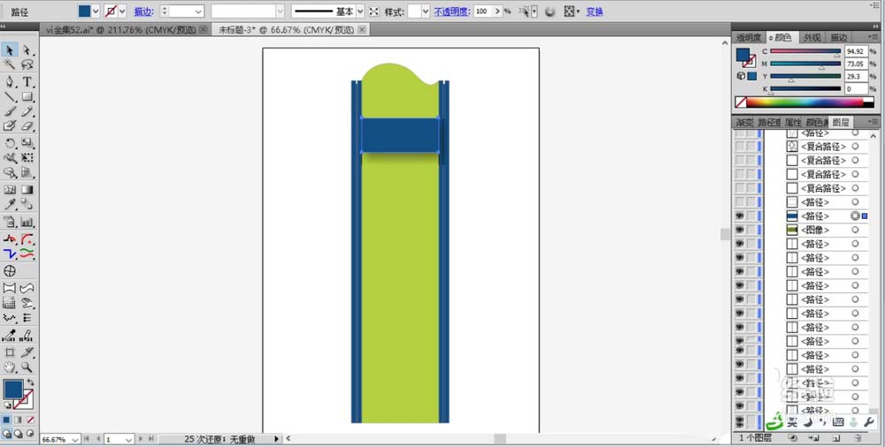 6、用草绿色填充标牌所在的路径,用蓝色填充标牌左右的矩形,还有标牌上方的矩形。