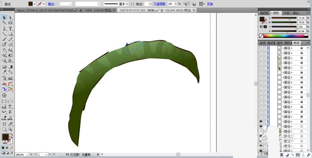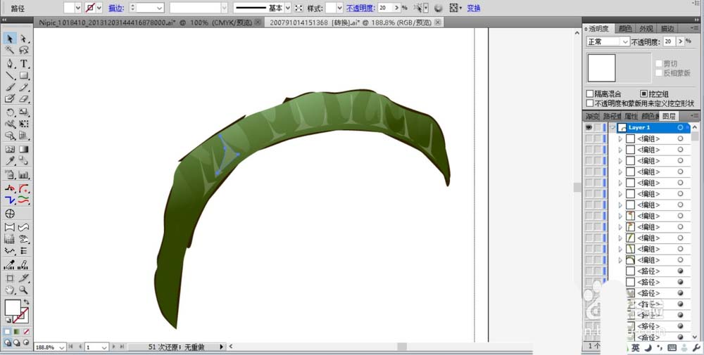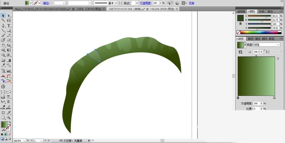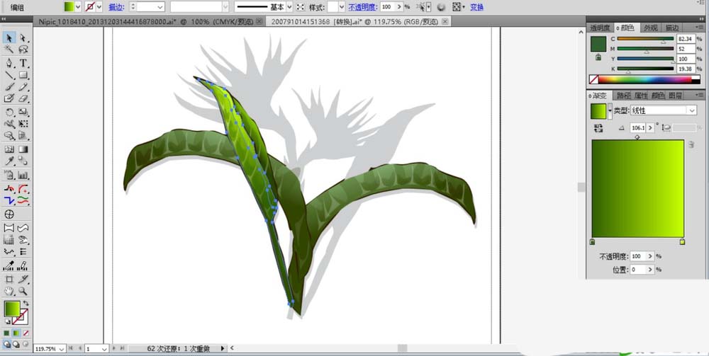 1、先用钢笔画出天堂鸟花的长长弯弯的叶片,我们用绿色填充叶片的轮廓,再用半透明的绿色渐变填充叶片的高光区域与暗光区域,高光用绿白色的渐变,暗光区域用绿色的渐变。