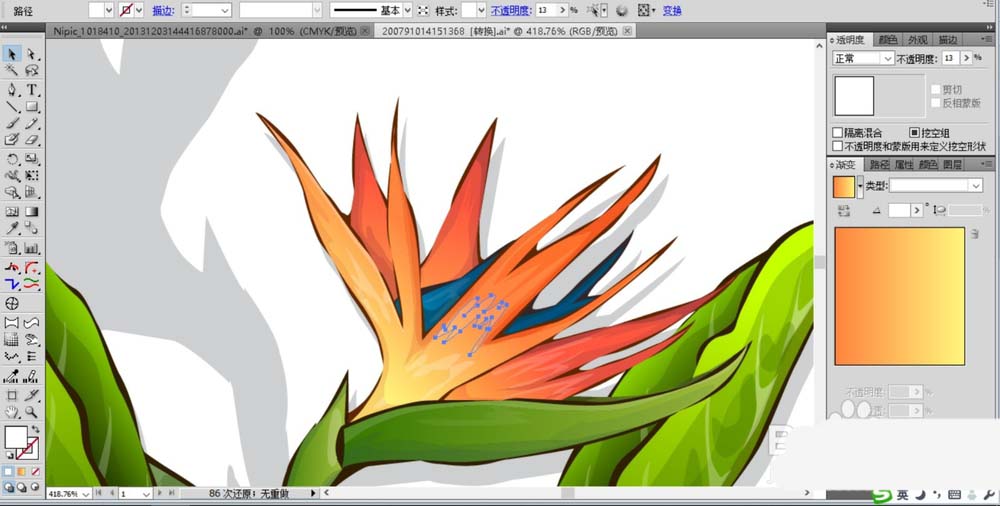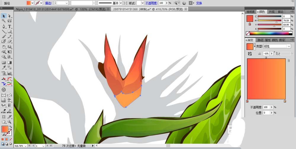 8、继续用同样的方法绘制出天堂鸟花的其它的花瓣,我们用橙黄色的渐变与橙红色的渐变填充出花瓣的色调的变化。