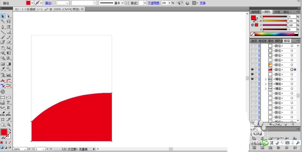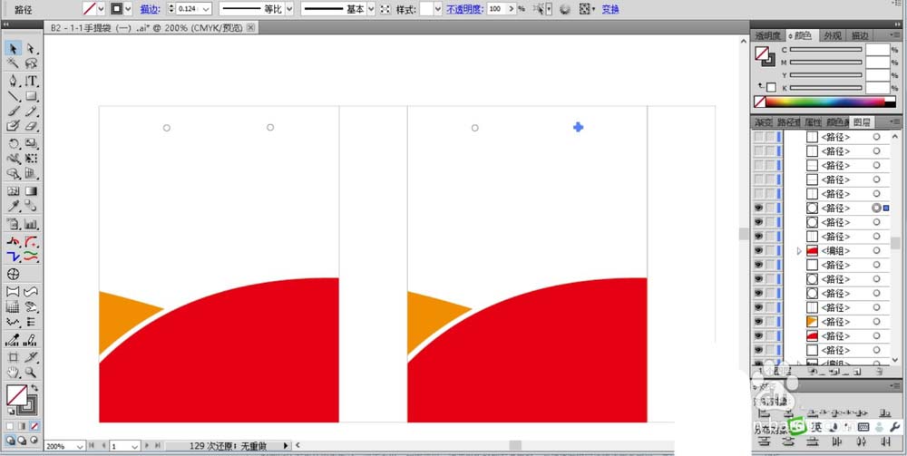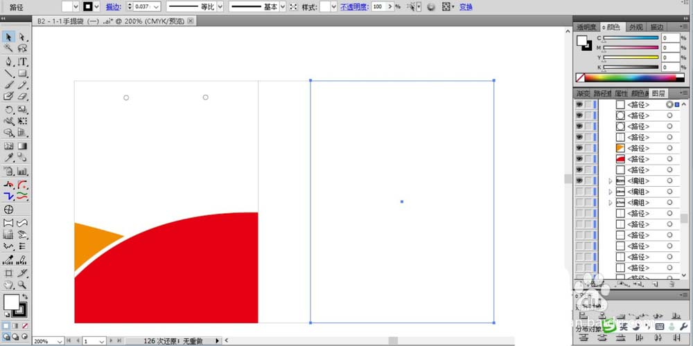 1、先来分析一下手提袋的结构,我们要印刷手提袋必须要完整的印刷手提袋的四个面,两个正面与两个侧面,其中正反面的内容都是两两相同的,有了这种分析这后,我们就可以用线条来画出手提袋的展开图的框架路径了。首先,我们用矩形工具画出手提袋的正面路径,再用钢笔工具画出手提袋正面的图案路径,用红色填充右侧圆弧的一部分。