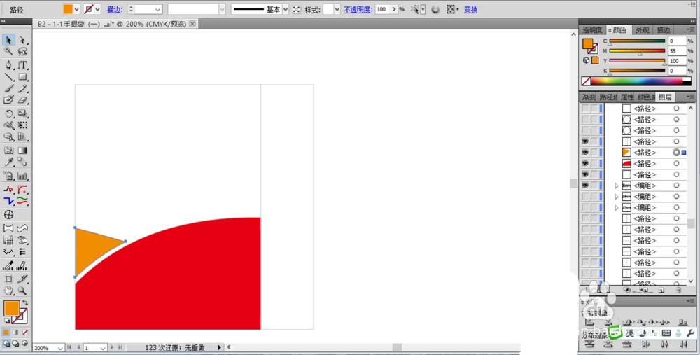 2、接着,我们用橙色填充手提袋正面的左侧小圆弧。并继续用矩形工具画出手提袋的中间侧面展开矩形。