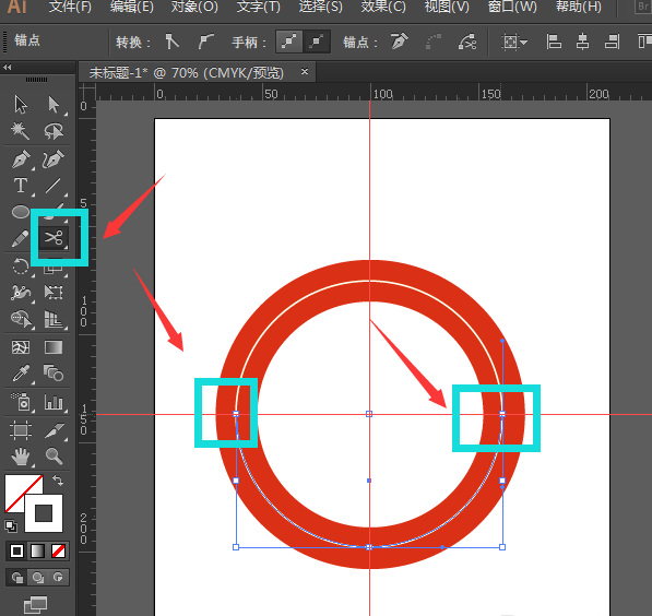 3、选择剪刀工具,在路径圆的左右两个锚点各点击一下,将其裁剪