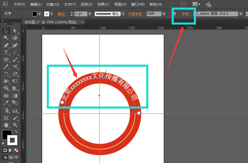 5、路径文字都是有方向的,如图,上面的路径就是顺时针方向的,所以输入的文字也是顺指针,调节下文字大小以及颜色,现在可以看到文字并不是在圆环的中心地带,这时候不要放大缩小调节位置