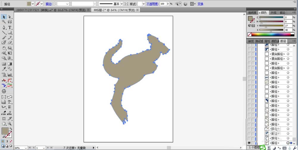 1、先选择钢笔画出一只跳跃而起的袋鼠的剪影,重点就是尾巴、双腿、头部的动作轮廓,我们用灰色填充这个动作轮廓。