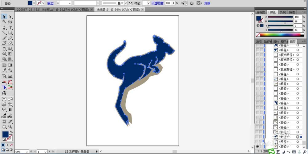 2、复制这个袋鼠的身体轮廓路径再缩小为90%左右,我们填充蓝黑色。