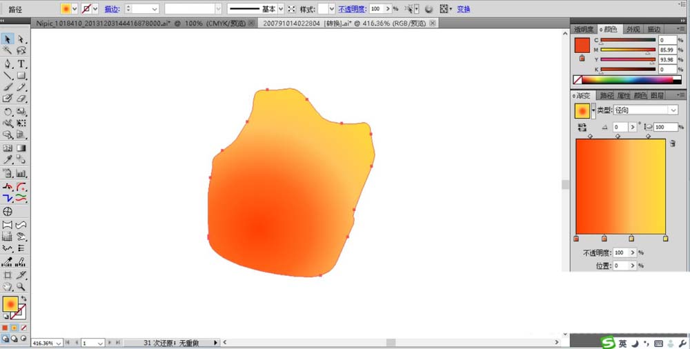 4、接着,我们开始绘制出花朵的花蕊形状,我们用橙黄色的渐变填充,在花蕊的中心继续用径向渐变绘制出明亮的橙黄色的色调。