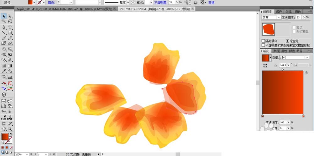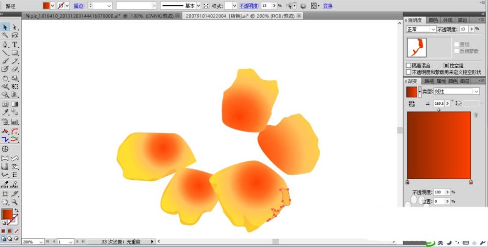 2、继续用同样的办法绘制出更多的花瓣,让花瓣围绕一个圆形进行分布。在花瓣的边缘,我们用红色的渐变设置成半透明的效果,让它们成为花瓣的暗光区域。