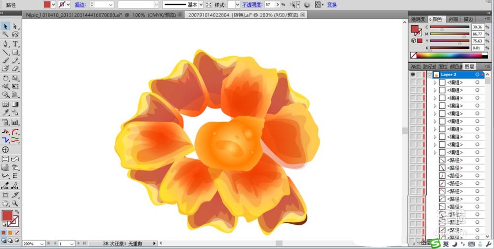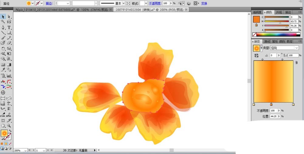 7、这一步,我们继续用相同的方法绘制花朵的中间的高光区域,花瓣小一些,花瓣的色调呈现橙黄色的效果。