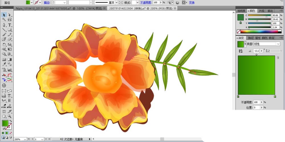 6、继续使用钢笔工具画出花朵右侧的绿色枝条,我们用绿色的渐变填充枝条,用网格工具画出绿色的渐变填充叶片,从而完成右侧枝条的绘制。