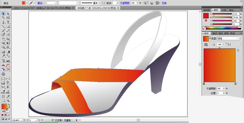 9、设置一个橙色的渐变,我们用橙色的渐变填充凉鞋的前面鞋带路径。