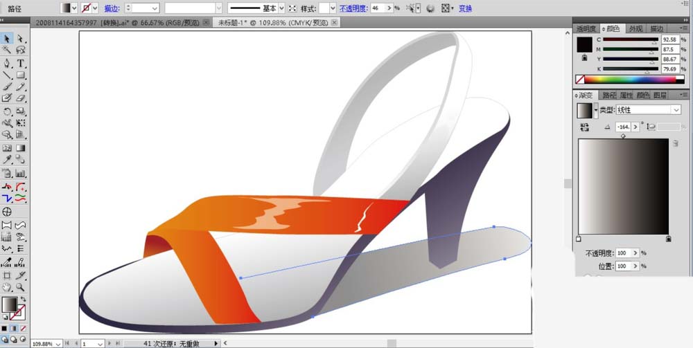 7、设置一个灰黑色的渐变,我们用灰黑色的渐变填充凉鞋的鞋跟路径。