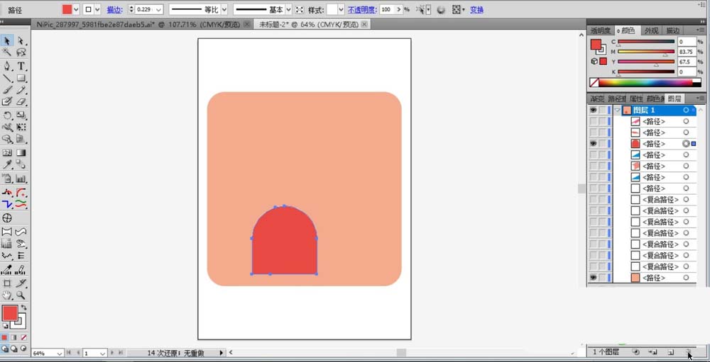 2、我们使用圆形与矩形工具结合画出一个小小的半圆门洞形状并填充深粉色。