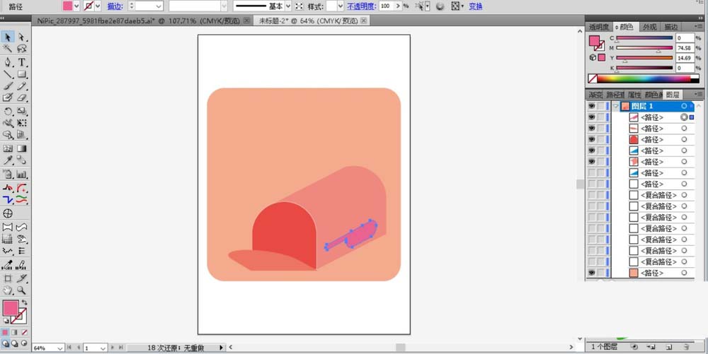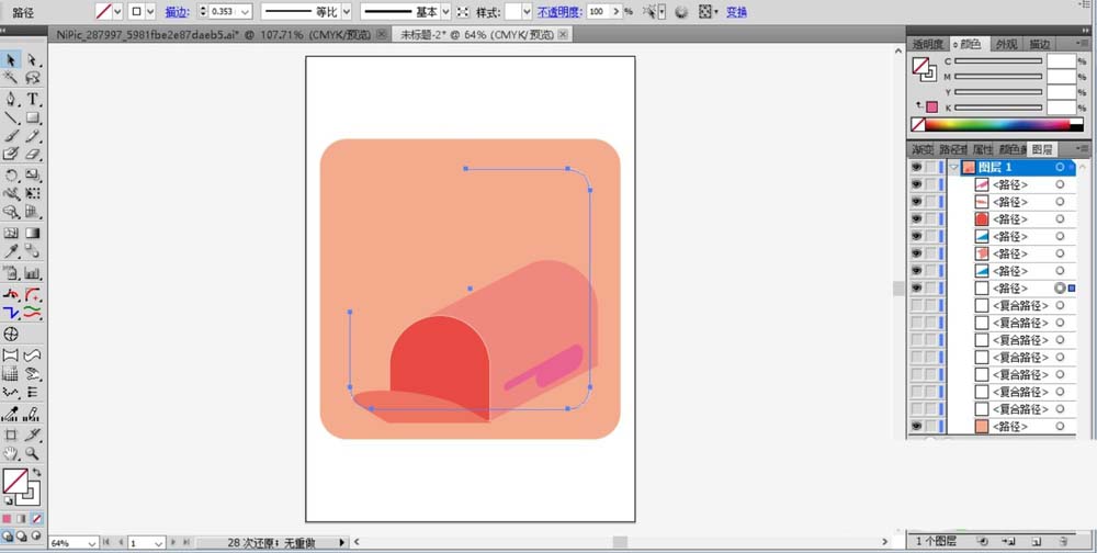 3、选择钢笔工具画出邮筒的右侧面形状,用锚点调整一下曲线的弯曲度并填充粉色。在邮箱的右侧画出一个粉色的暗光路径。再在邮箱的左侧画出一个筒盖的形状并填充粉色。