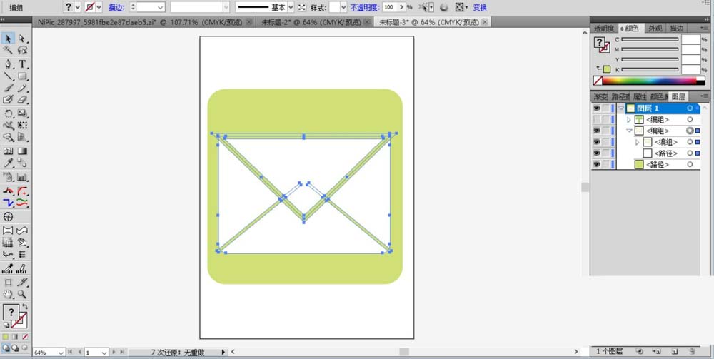 7、我们还可以设计一个邮件的图标,先用矩形工具画出一个圆角的矩形并填充草绿色,再用钢笔画出四个三角形并填充为白色。让四个三角形组成一个邮件的形状。