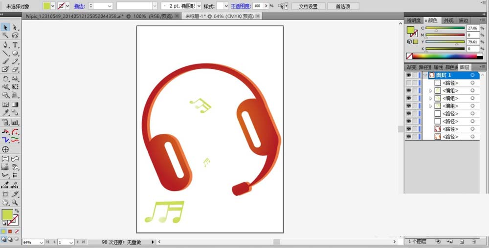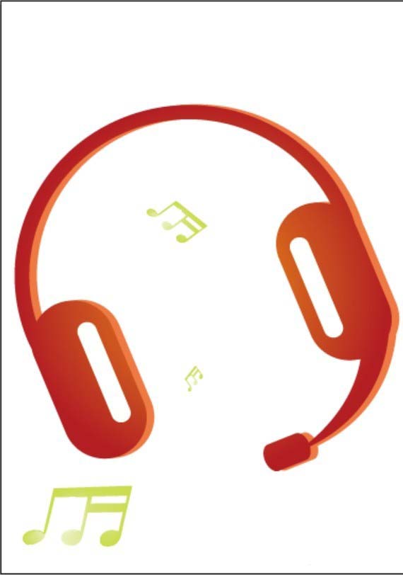 6、在画出中置入音符的路径,我们用草绿色填充这些音符,并做出网格渐变的效果,不断的复制音符并改变大小与方向,我们完成耳机简笔画设计。