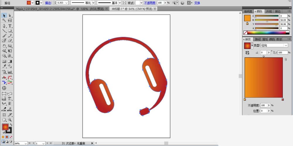 4、设置一个火红色的渐变填充这个耳机的轮廓路径,听筒上面的矩形用白色填充。