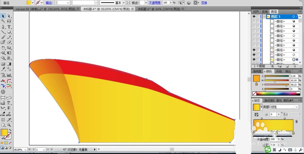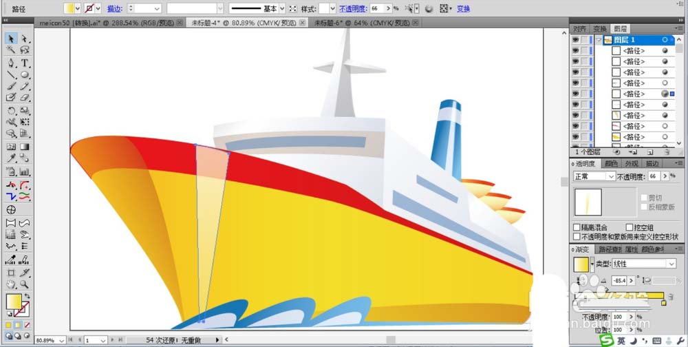 5、设置一个黄色的渐变与一个红色的渐变,我们分别填充游轮的船舱与船弦等路径。