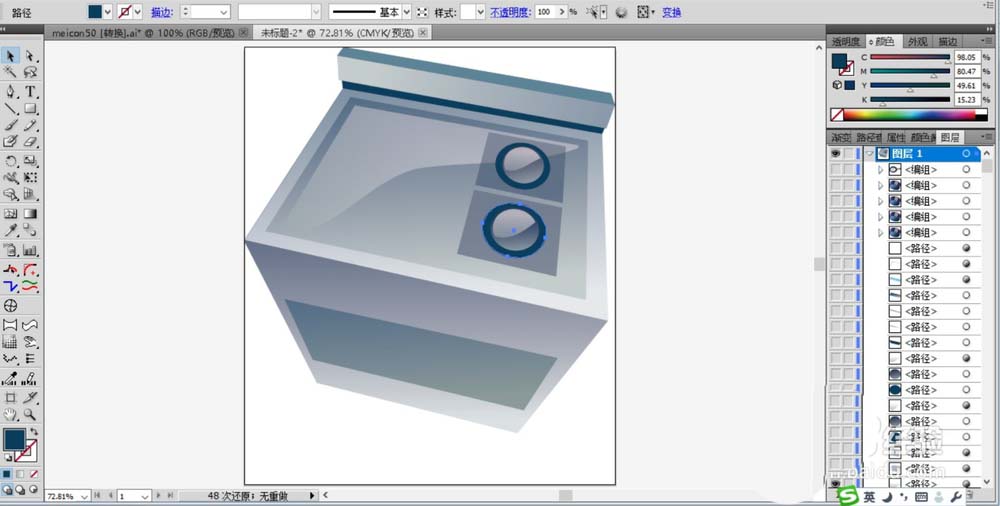 3、绘制出煤气灶的顶端的四个火点,还有煤气灶顶端的高光区域的路径。