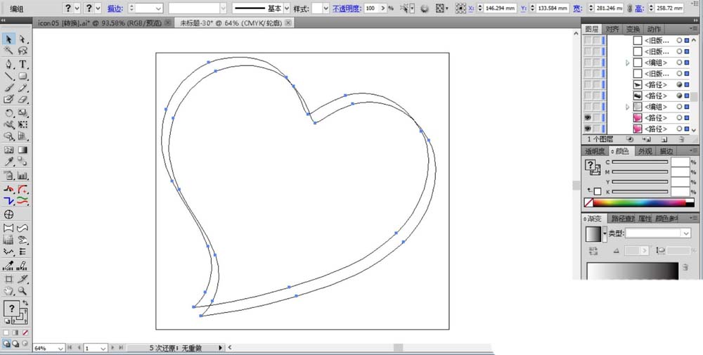 1、使用钢笔工具画出一个心形的形状,我们绘制完成心形之后再复制一下,让两个心形错位,从而好做阴影效果。
