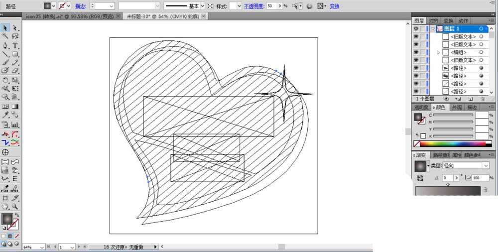 5、我们设置一个灰黑色的渐变填充心形上面的所有的矩形,设置渐变的混合模式为滤色,让它呈现一个白色的渐隐效果。