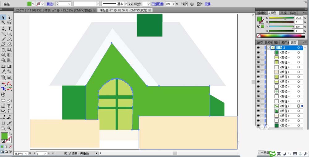 6、我们还可以选择另外的一种配色方案,我们用深绿色填充墙壁的暗区,用淡绿色填充墙壁的高光区域,用草绿色填充门,从而绘制出绿色的小屋。