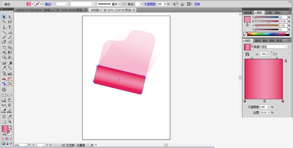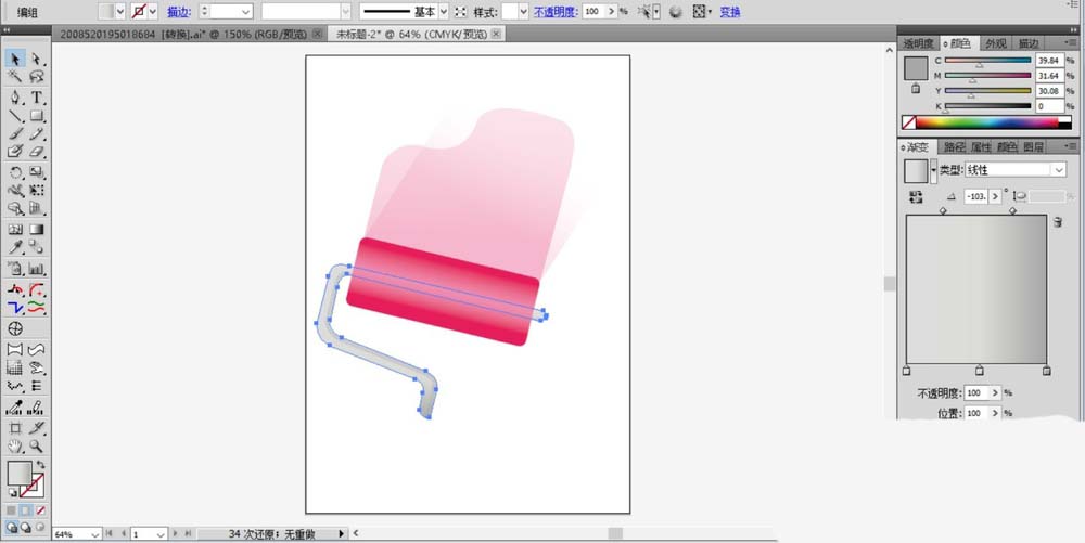 5、我们用粉红色的渐变填充滚筒的路径,并用半透明的白色填充中间的高光区域。