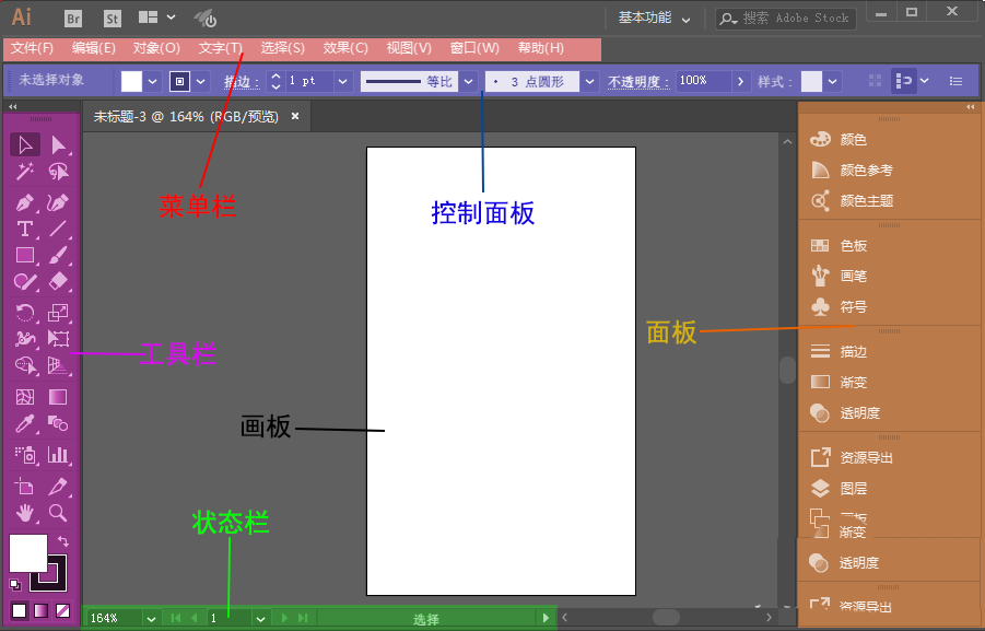 工作区。如果您熟悉Photoshop,则Adobe Illustrator工作区不会让您感到意外,因为它们的主要部分基本相同。您将主要使用“工具栏”,因为您需要的所有工具都在那里。要配置正在使用的工具,您将使用控制面板,这里保留着当前工具的所有选项。当然,面板 - 它保留了如色板,图层,画笔等选项。