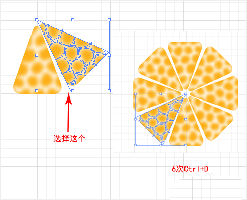 11、一个小技巧。有一个小技巧,很实用,就是用一个键盘快捷键(Ctrl + D)。它重复或应用最新的变换到所选对象。选择新的橙子瓣并使用“Ctrl + D”6次。瞧! 我们有一个美味的橙子了。